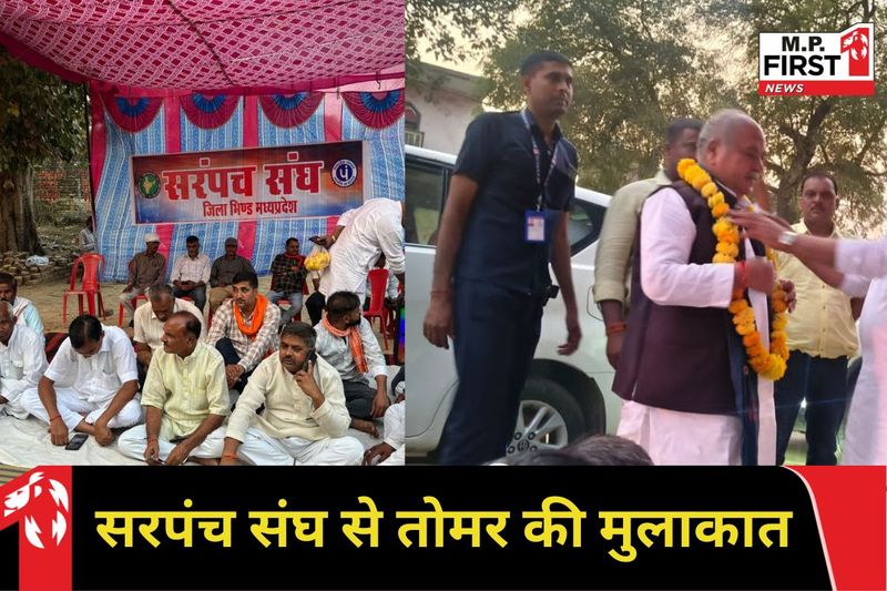 narendra singh tomar  विधानसभा अध्यक्ष नरेंद्र सिंह तोमर पहुंचे भिंड  मांगों को लेकर टेंट लगाए बैठे सरपंचों से की मुलाकात