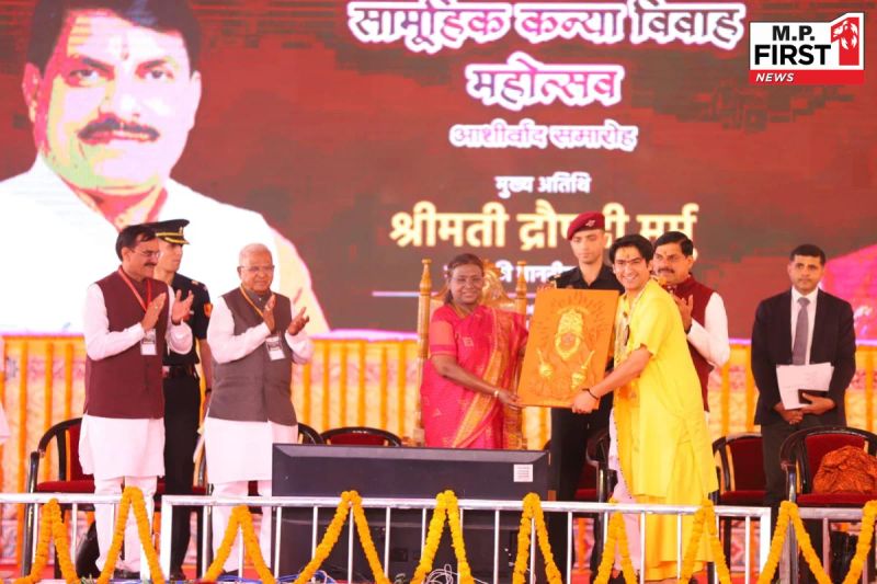 Draupadi Murmu Bageshwar Visit: खजुराहो। खजुराहो स्थित बागेश्वर धाम में 251 जोड़ों का सामूहिक विवाह महोत्सव हो रहा है। कार्यक्रम में शामिल होने के लिए देश की राष्ट्रपति द्रौपदी मुर्मू पहुंची हैं। राष्ट्रपति का स्वागत करते हुए बागेश्वर धाम के पंडित धीरेंद्र शास्त्री ने उन्हें हनुमान यंत्र भेंट किया। राष्ट्रपति एयरफोर्स के विमान से खजुराहो एयरपोर्ट पर आईं। यहां से हेलिकॉप्टर से बागेश्वर धाम पहुंचीं। उन्होंने बालाजी मंदिर में दर्शन कर पूजा-अर्चना की। इसके बाद विवाह समारोह में शामिल होने पहुंची। इस दौरान मध्यप्रदेश के राज्यपाल मंगुभाई पटेल और मुख्यमंत्री डॉ. मोहन यादव भी मौजूद रहे। धाम में वे करीब चार घंटे रुकेंगी। यहां से दोपहर 3:10 बजे वडोदरा के लिए रवाना हो जाएंगी।